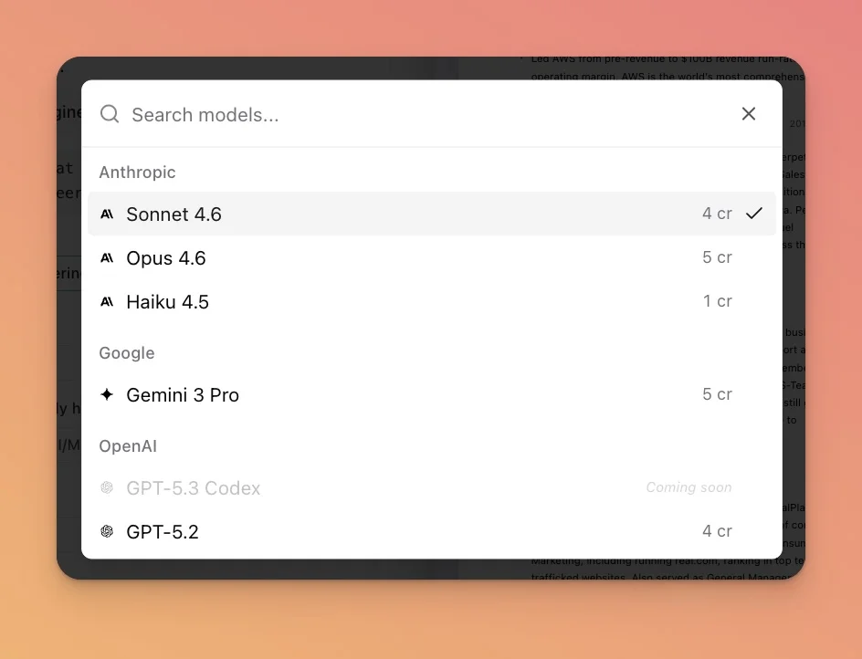We added Opus 4.6 on February 5, the day Anthropic released it. It's the most capable model in the selector at 5 credits per message, one more than Sonnet 4.6's 4.